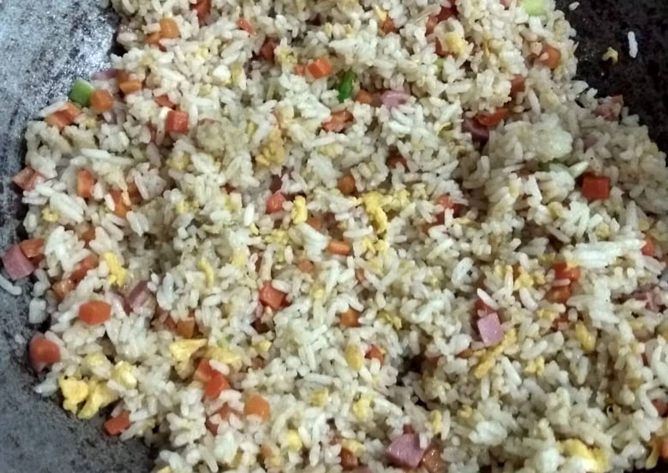 - Masukkan wortel dan sosis, aduk rata. Masukkan nasi putih dan beri bumbu lainnya. Aduk rata. Koreksi rasa. Masak dg api besar sebentar saja. Lalu matikan api. Siap dinikmati