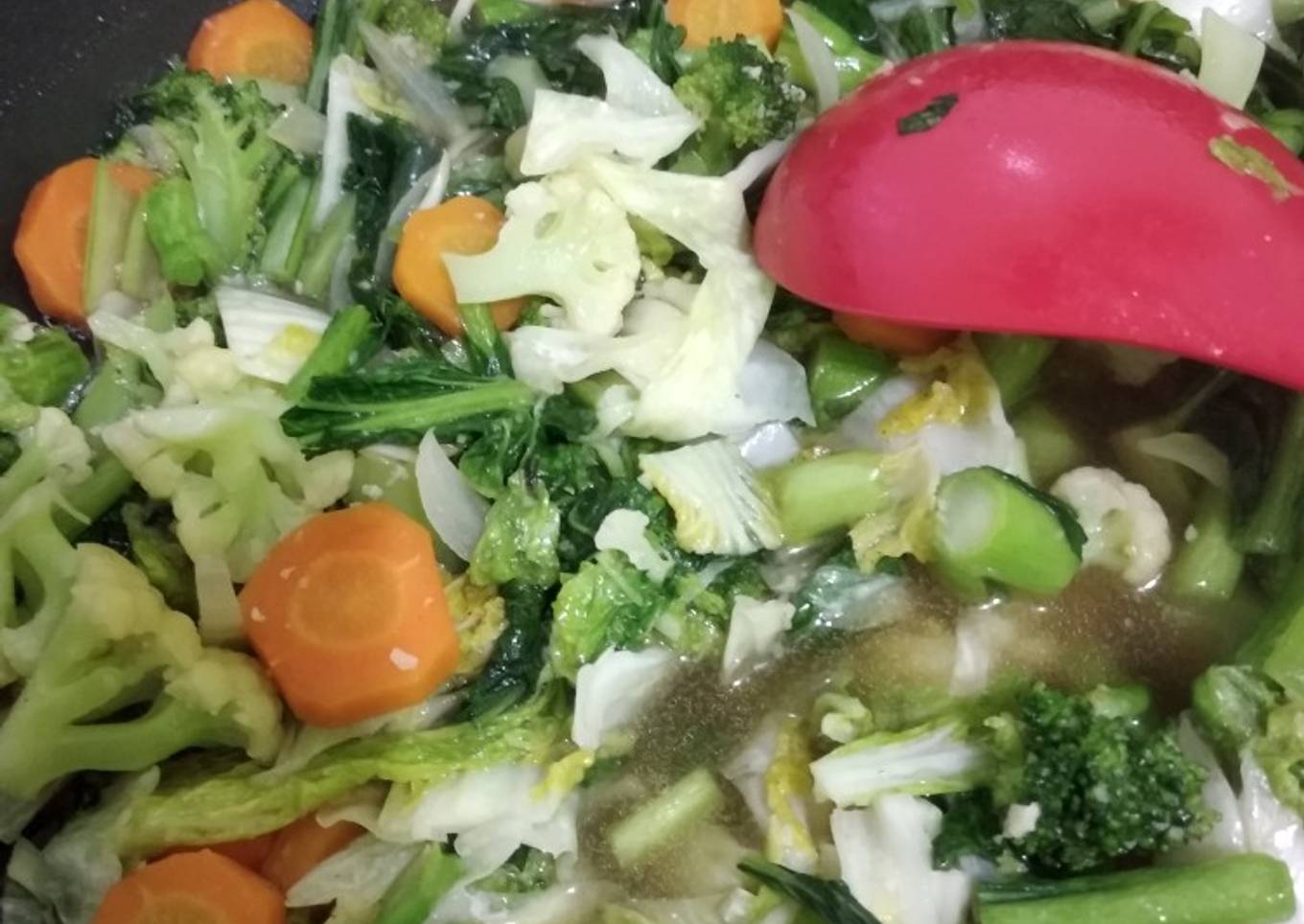 - Tumis bawang putih (saya pakai baceman bawang) dan juga bawang bombay sampai harum menggunakan margarin. Setelah harum masukkan saus tiram, minyak wijen, dan lada. Tumis kembali lalu masukkan sayuran, dari wortel+brokoli+kembang kol, sawi putih+kol, terakhir sawi hijau. Tumis kembali.
