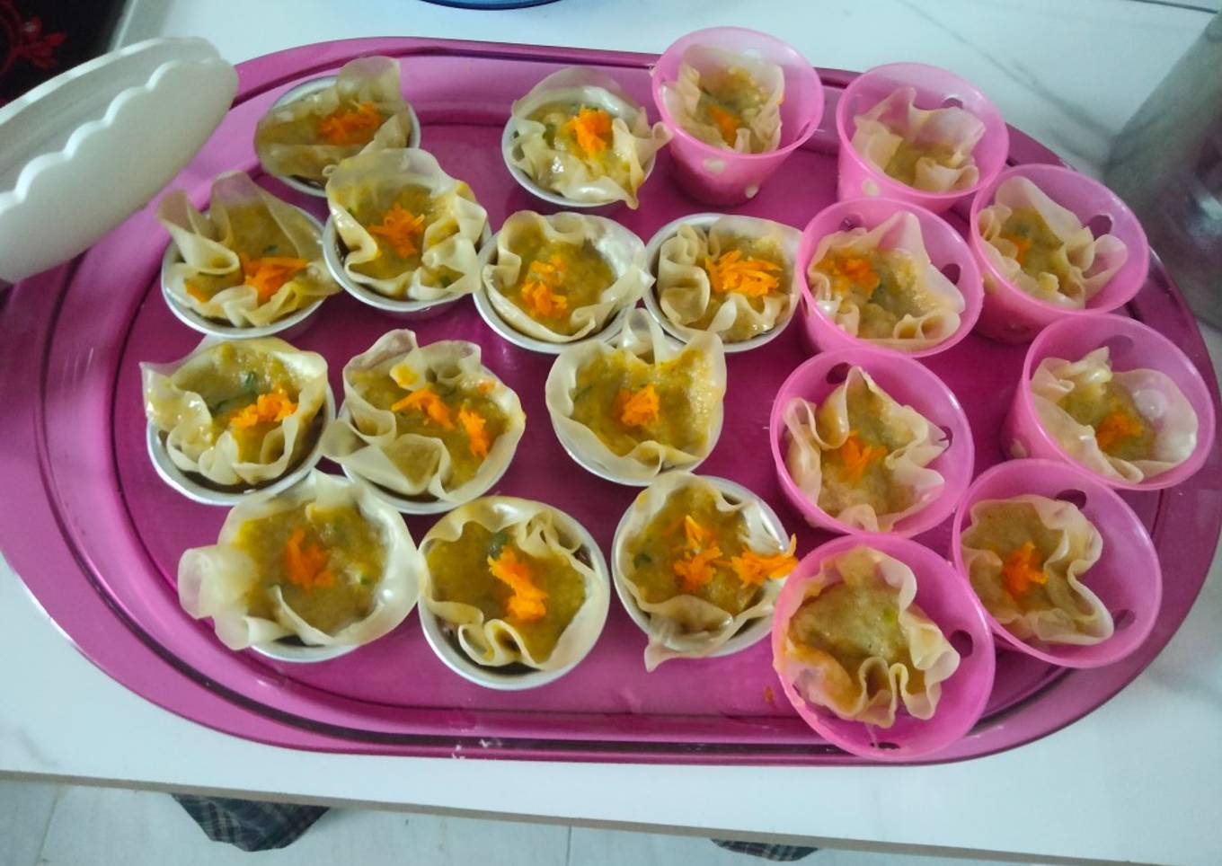 - Tambahkan adonan kedalam kulit dimsum. Tambahkan dengan parutan wortel. Lalu kukus hingga matang lebih kurang 15 menit.