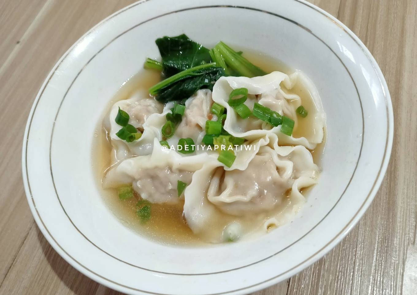- Di panci terpisah, rebus pangsit setengah matang agar kuah kaldu tidak terlalu starchy. Sajikan pangsit dengan kuah kaldu dan sawi serta irisan daun bawang. Bisa ditambahkan minyak wijen dan kecap asin kedalam kuah sesuai selera.