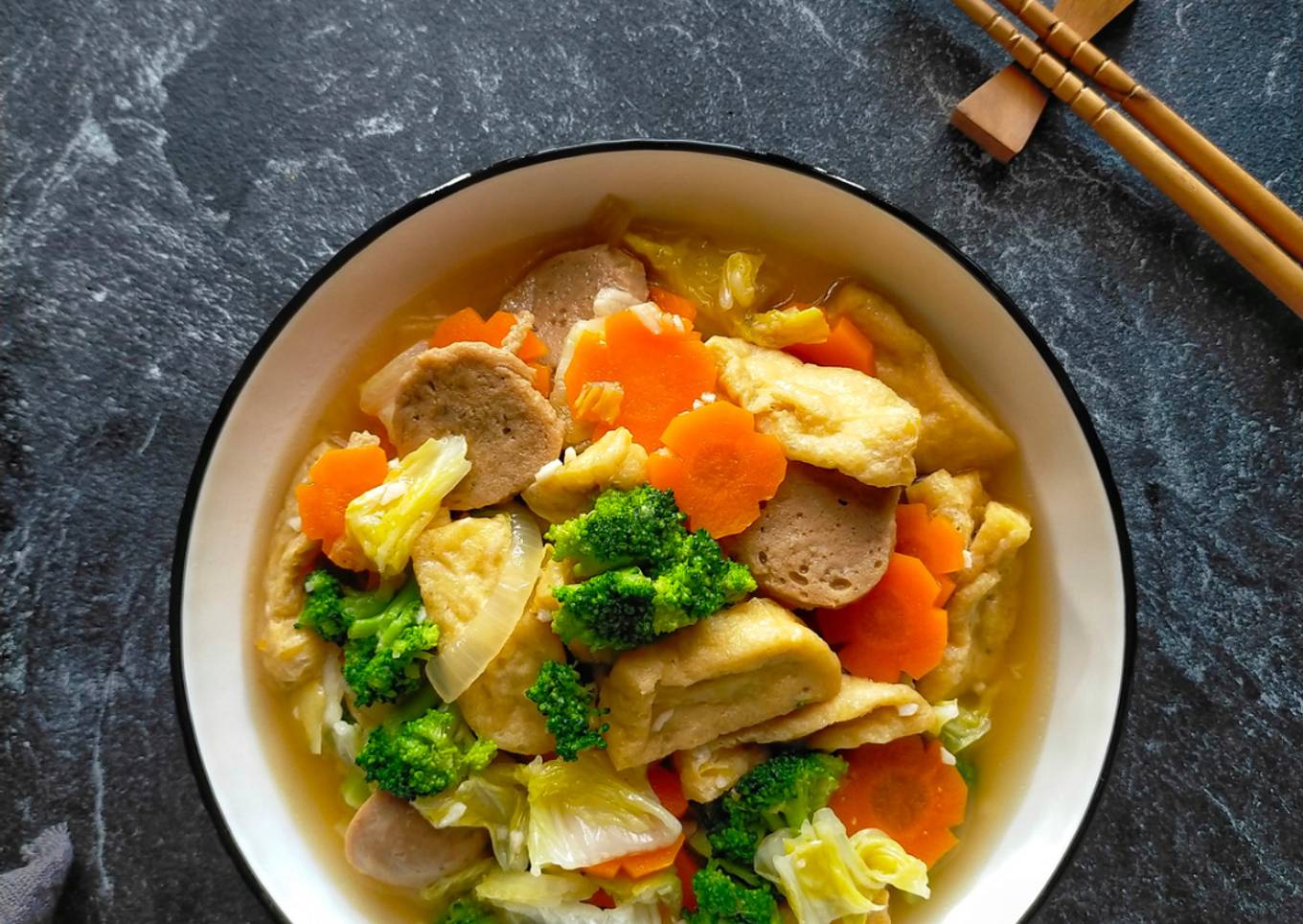 - Tumis bawang putih, bawang bombai dan jahe sampai harum. Masukkan air, wortel, baso, saos tiram, minyak wijen, gula pasir, garam dan lada bubuk. Aduk rata. Masak hingga wortel setengah matang. Masukkan tahu dan sawi putih. Aduk rata. Masak hingga semua sayuran matang. Tes rasa.