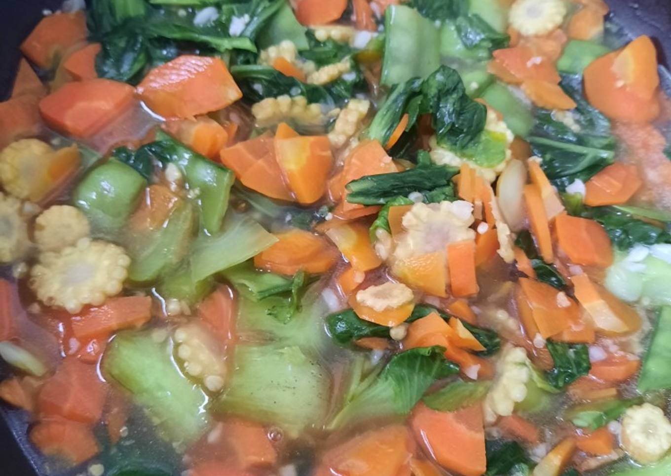 - Masukkan bahan yg keras dahulu (wortel, putren dan kapri) oseng2 hingga aga matang, lalu masukkan sayuran (pakcoy) oseng2 sebentar lalu tambahkan saus tiram dan air sedikit (50-100ml), bumbui dengan garam dan gula, masak hingga matang