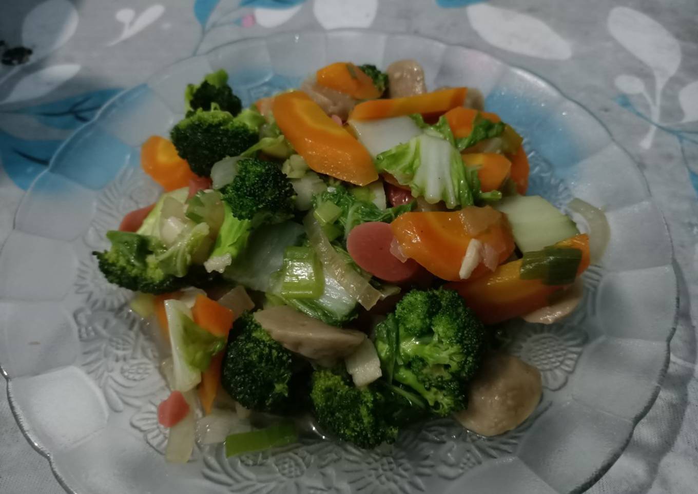 - Masukkan sayuran yang lain, irisan bakso dan sosis, aduk rata