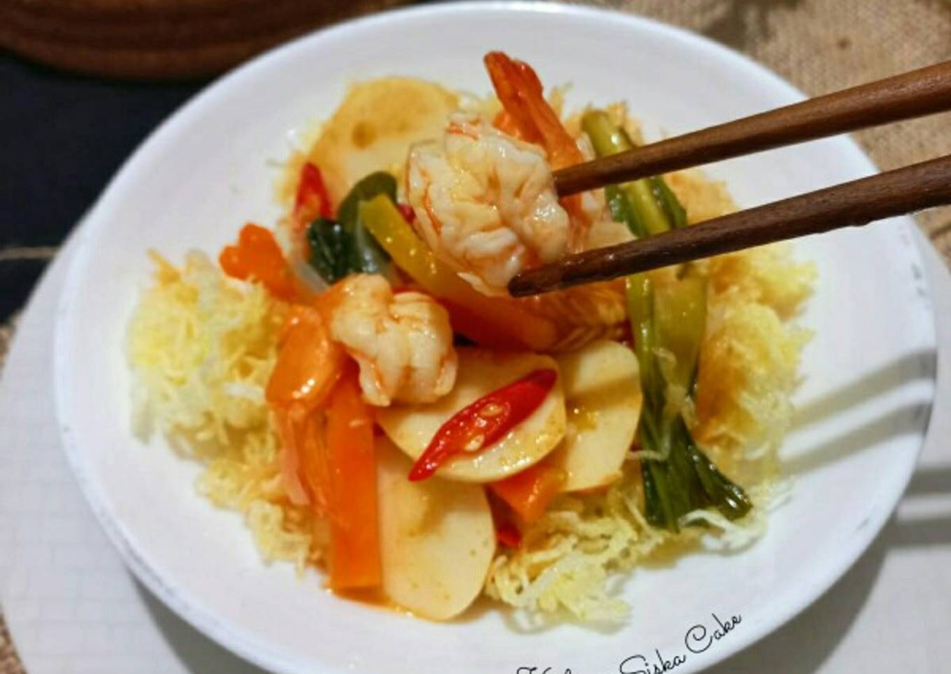 - Saus : Tumis bawang putih, bombay dan jahe sampai harum. Lalu masukkan udang dan bakso ikan,aduk sampai berubah warna.