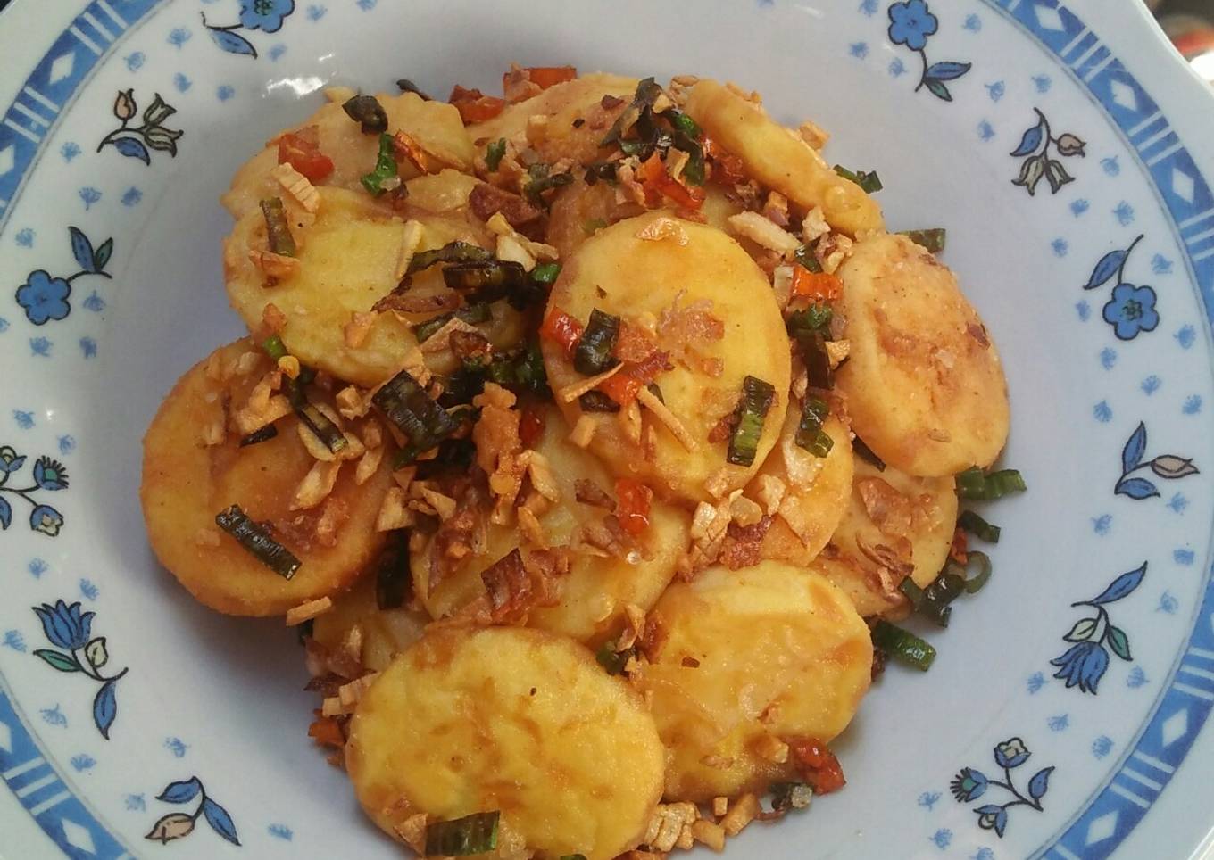 - Masukkan tofu yang sudah digoreng, aduk rata. Kemudian tambahkan bawang putih goreng aduk lagi. Angkat dan sajikan