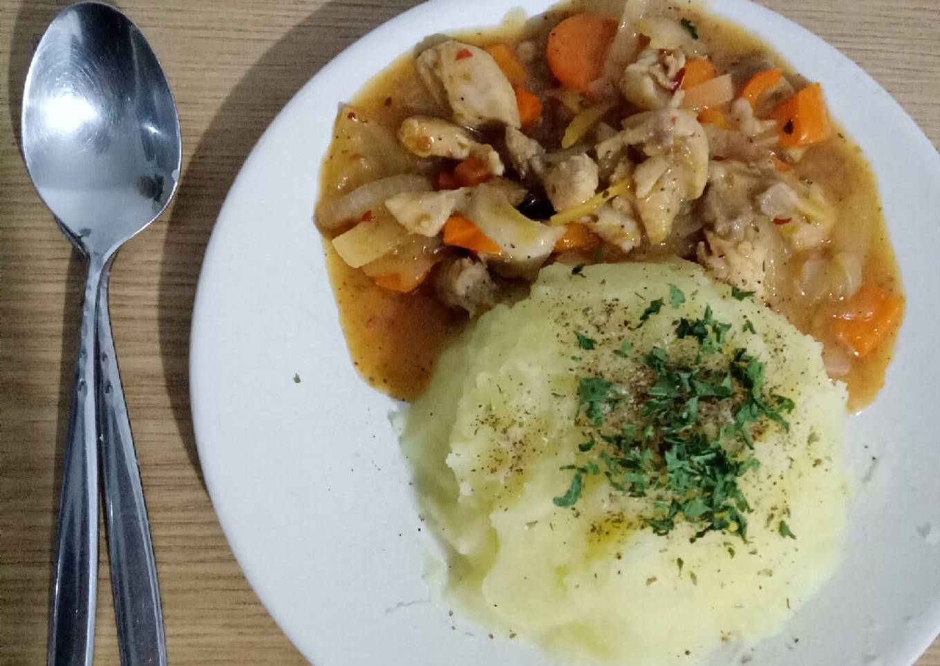 Saya lebih suka pasangannya nasi, tapi suami minta kentang yawes ngalah. Toh sama2 enak, di piring saya suadah lumat, di piring suami masih berbentuk bongkahan.