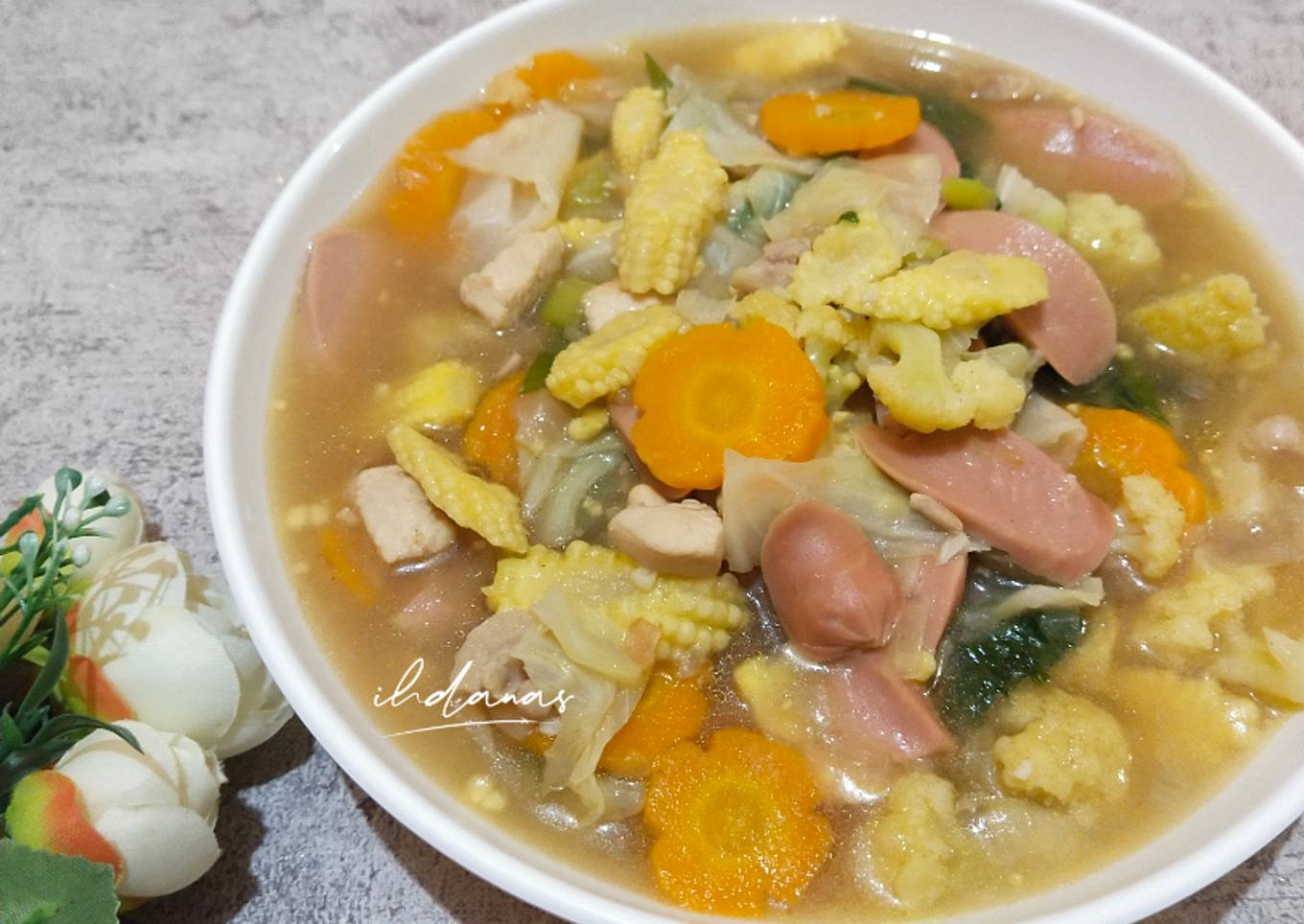 - Masukkan irisan wortel, sosis, putren dan bunga kol. Aduk sampai layu. Tambahkan air.