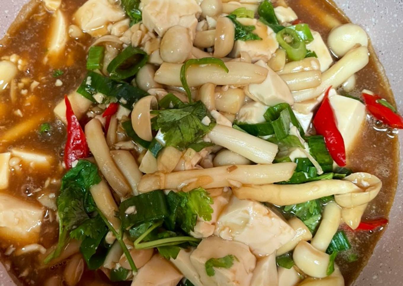 - Lalu masukan jamur dan saus2an, lalu kaldu bubuk, aduk rata lalu masukan tahu sutera aduk pelan2 jgn sampai tahunya hancur sekali ya.