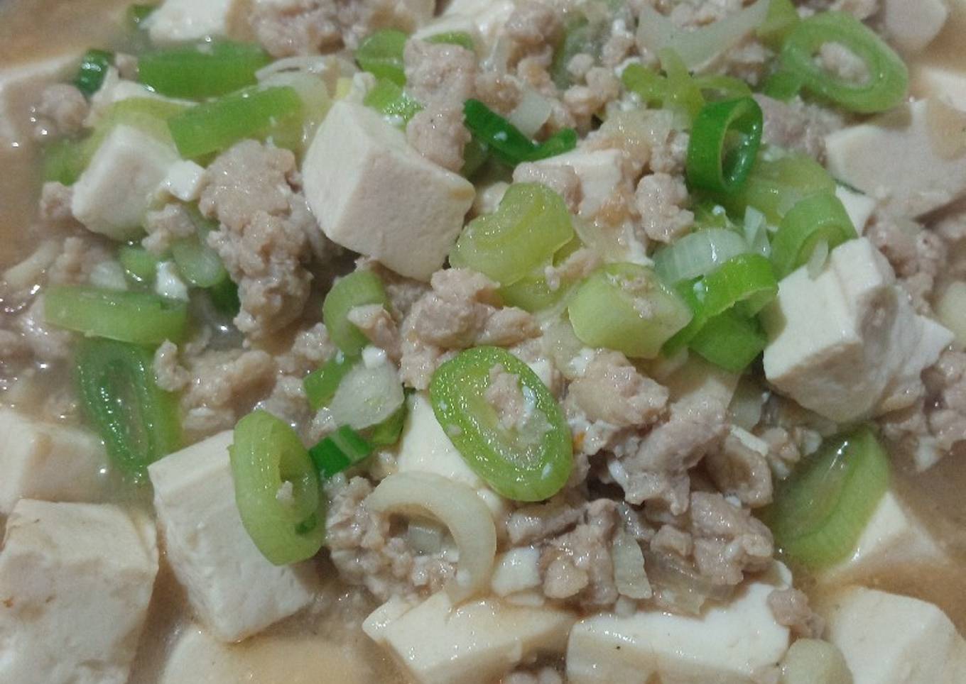 - Masukkan potongan tahu. Masak sebentar, tambahkan daun bawang, minyak wijen dan larutan maizena untuk pengental. Tumis hingga mendidih dan matang.
