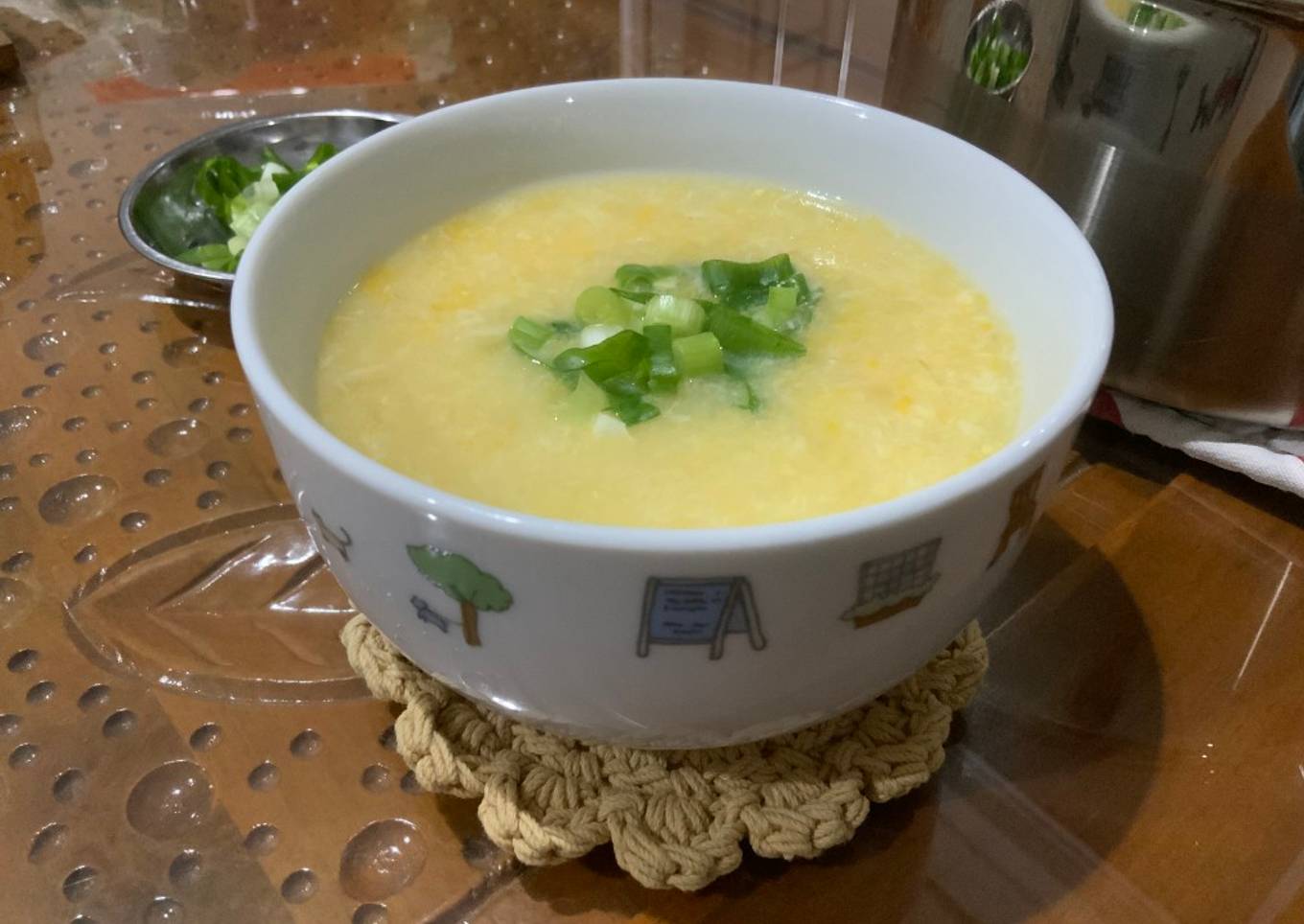 - Panaskan air, masukkan jagung pipil, hasil blenderan tadi, dan bawang bombay. Masak hingga jagung matang. Beri bumbu2, lalu tes rasa. Kecilkan api, masukan larutan maizena. Aduk hingga mengental. Lalu terakhir masukan kocokan telur perlahan, sambil aduk sup, agar telur membentuk jaring2 halus