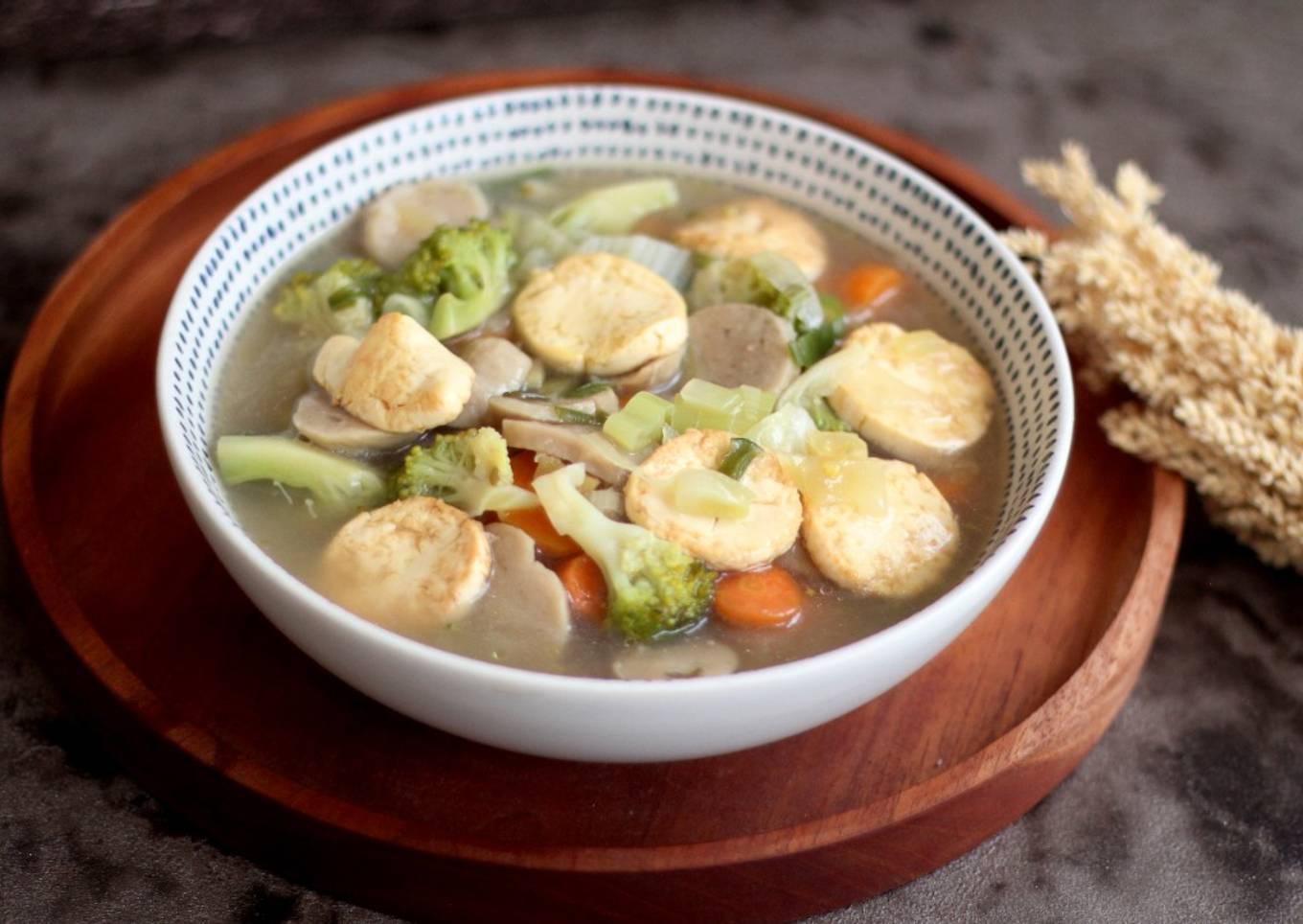 - Setelah semua sayuran dicuci bersih, iris tipis wortel. Potong-potong brokoli dan sawi putih. Lalu iris bakso menjadi agak tipis.