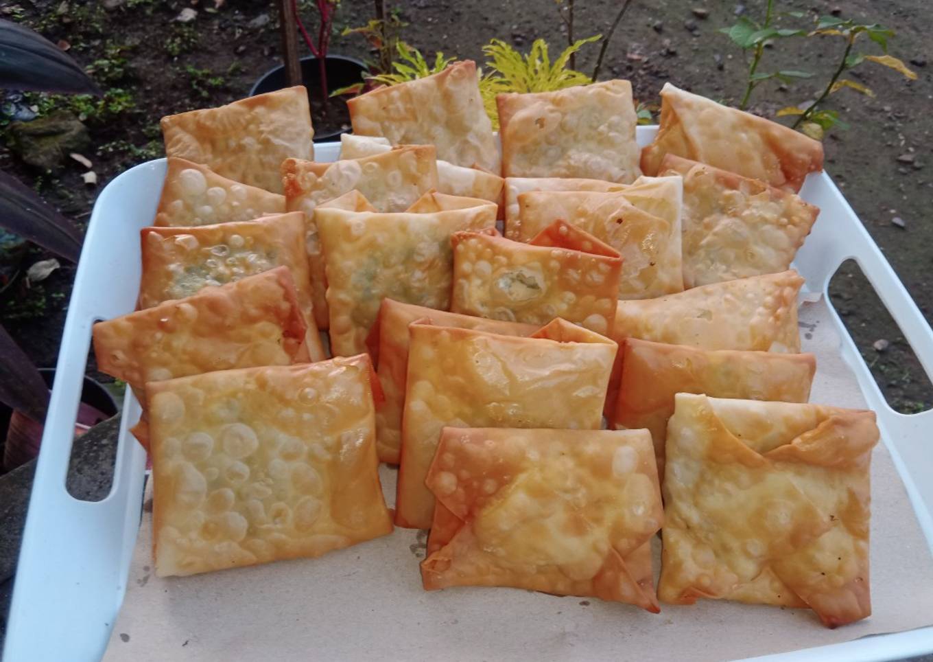 - Angkat sisihkan kemudian ambil 1 lembar kulit pangsit lipat menyerupai amplop ya. Di step kali ini kulit pangsitnya jangan kena angin lama2 agar tidak pecah, biarkan di plastik ambil satu2 atau beberapa saja. Lakukan sampai selesai, lem ujungnya menggunakan larutan air dan terigu.