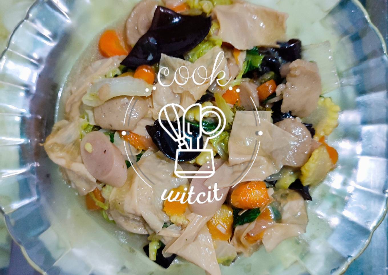 - Potong wortel, baby corn, sosis, bakso, sawi, jamur kuping