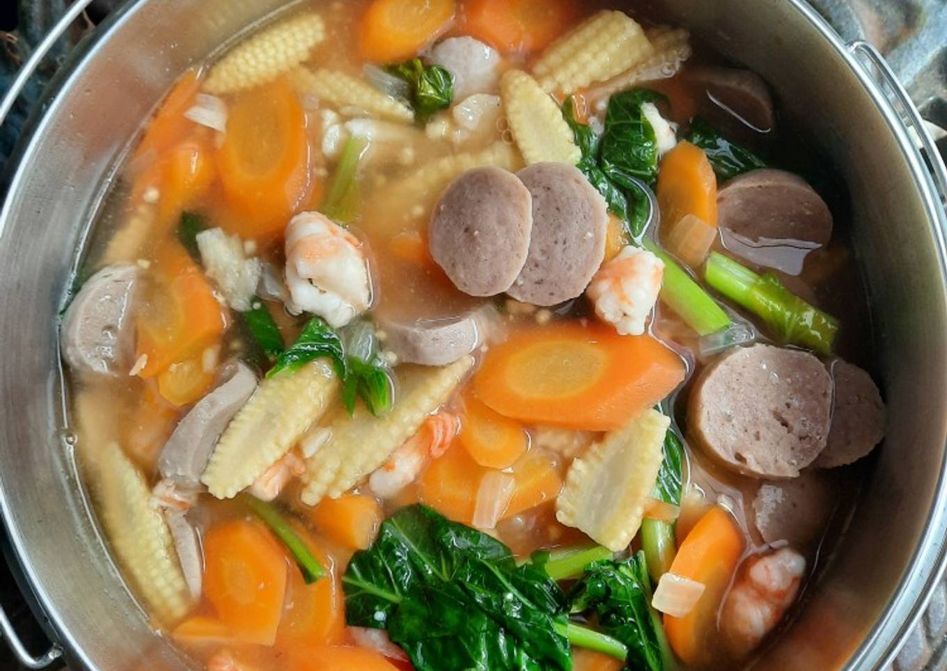 Masukkan udang dan baso, tumis hingga matang.masukkan sayur caisim, wortel dan jagung semi.