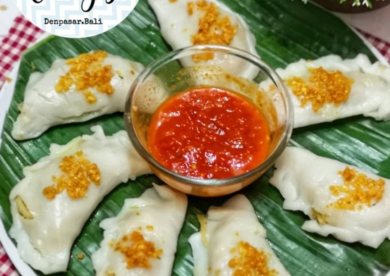 - 👉 Beri alas dengan tepung kanji, ambil adonan secukupnya dan bentuk bulat memanjang potong kecil agar ukuran sama. Lapisi tangan dengan tepung kanji bentuk adonan tipis bulat melebar dan beri isian bangkuang eratkan bagian atasnya.