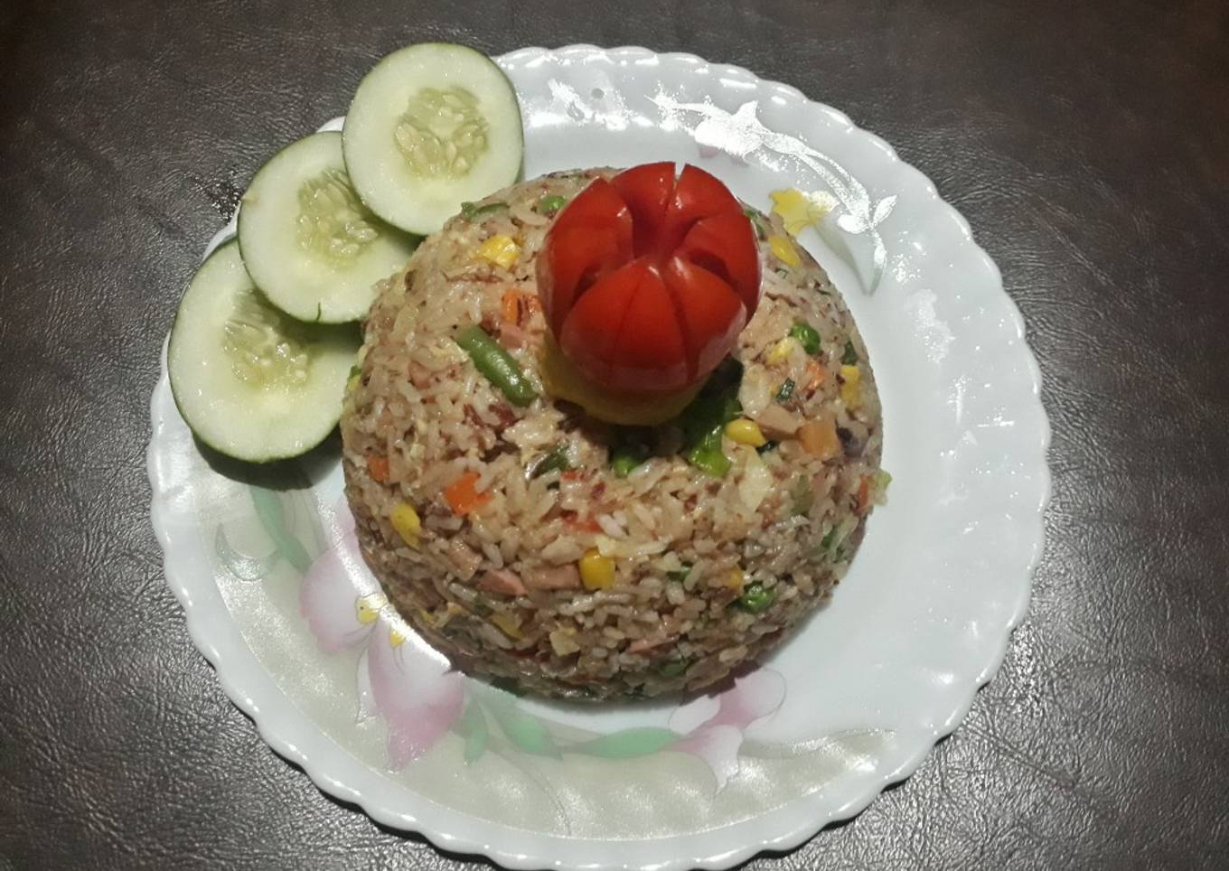 - Panaskan wajan, masukan 1 sdm margarin, masukan bawang, cabe, irisan daun bawang, tumis hingga menguning dan harum, masukan sosis, corned dan sayuran beku, tumis sebentar, sisihkan diwajan, masukan 1 sdm margarin, masukan telur diorak arik sebentar lalu masukan nasi, tumis sebentar dan masukan bumbu, tes rasa, masak hingga bumbu meresap lalu angkat.