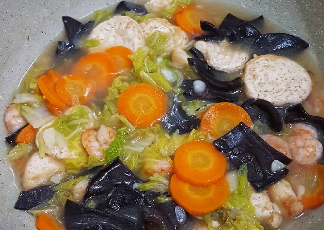 - Masukkan udang, jamur kuping, sawi putih dan tahu yang sudah digoreng