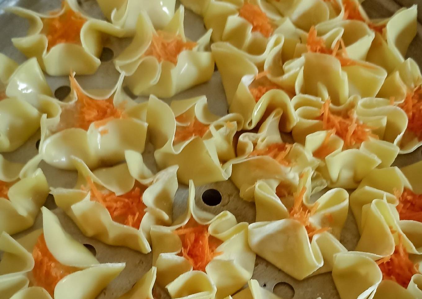 - Ambil kulit dimsum, kemudian beri adonan dimsum, bungkus kemudian beri parutan wortel di atasnya.