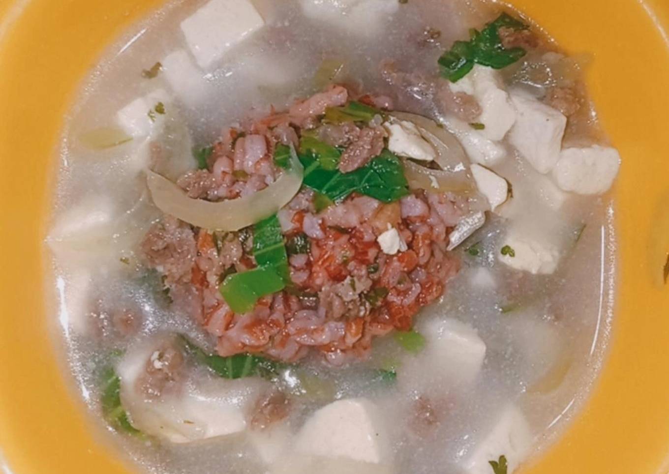 Langkah Mudah untuk Membuat Tim Nasi Merah w/ Sop (tahu, daging, pakcoy) yang Enak