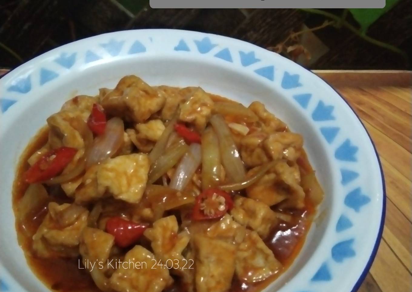 - Tumis bawang putih sampai harum, tambahkan bawang bombai, cabe merah. Tumis sampai harum dan sedikit layu. Masukkan bumbu-bumbu yang lain dan air 500 mL. Tes rasa. Masukkan tahu goreng dan biarkan kuah menyusut dan mengental.