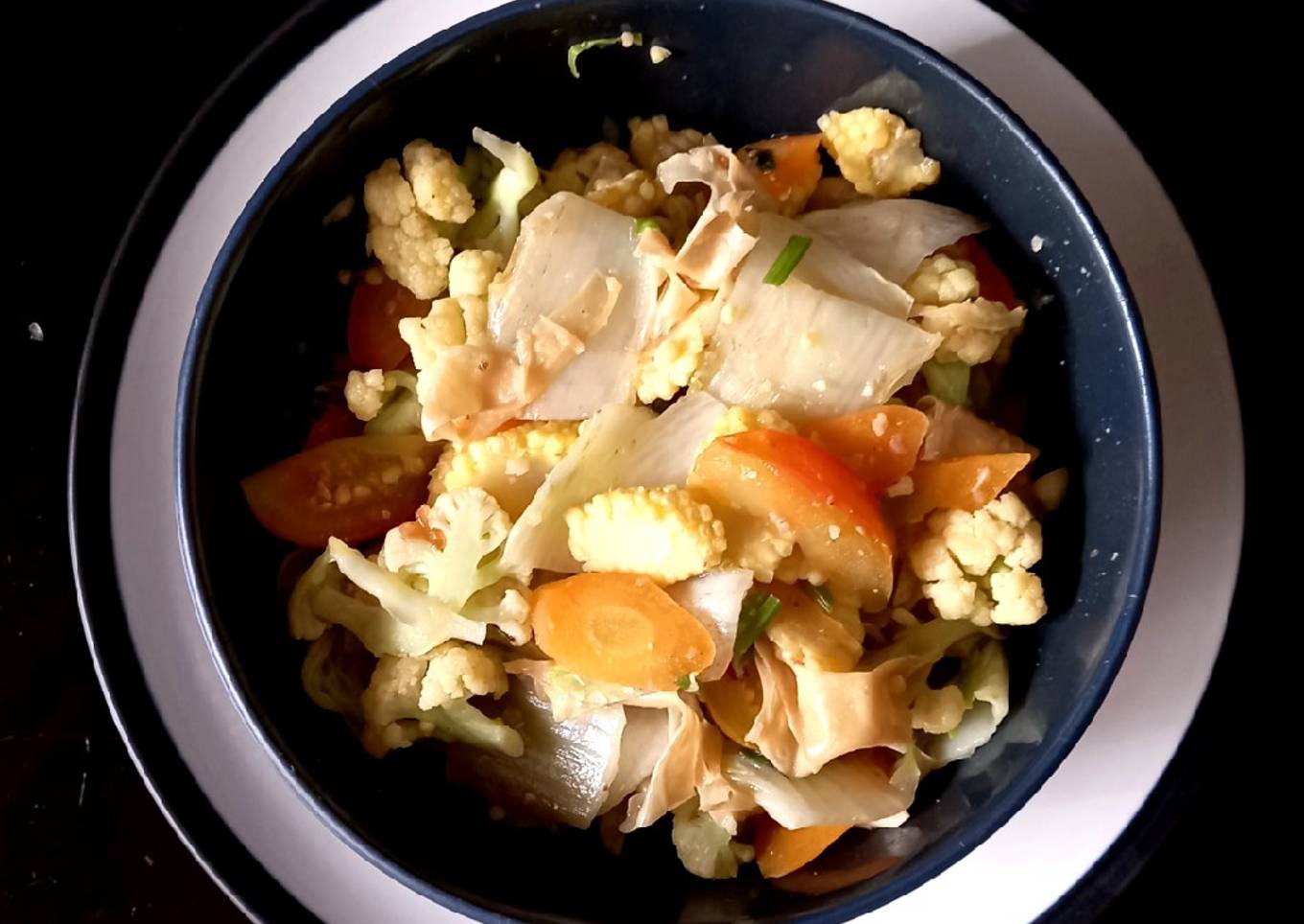 - Tumis bumbu halus sampai harum, masukkan wortel+ tomat+bawang daun-seledri, oseng sekitar 3 menit. Masukkan kulit tahu, oseng-oseng lagi sebentar. Terakhir masukkan sawi+jagung dan kembang kol, oseng lagi sekitar 5 menit. Taburi bawang goreng 😍