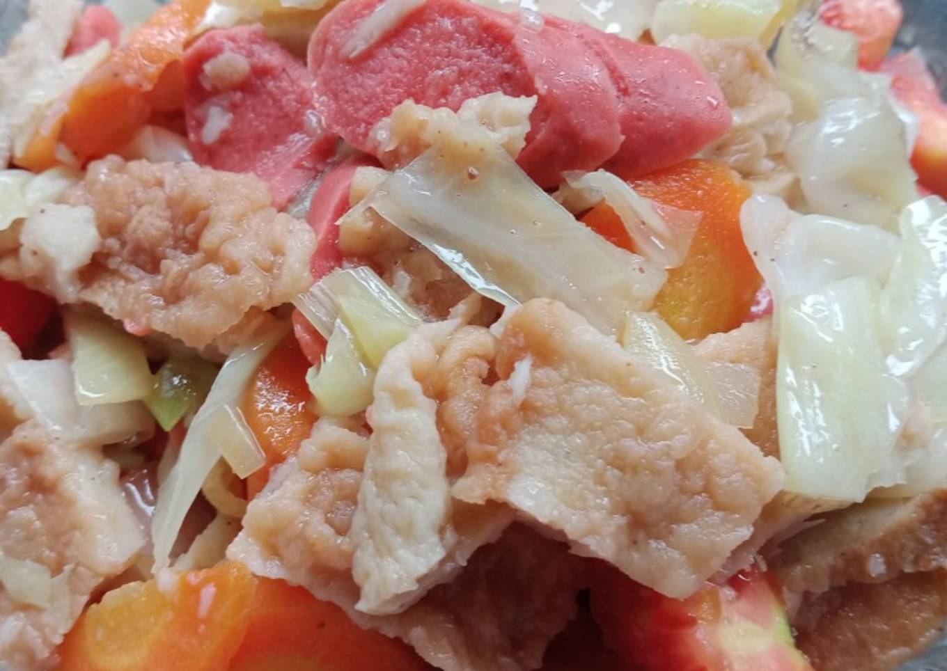- Siapkan secukupnya minyak goreng masukan bumbu halus dan bawang bombay lalu masukan wortel, sosis dan kol lalu beri secukupnya lada dan gula