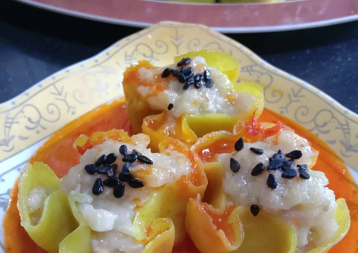 - Ambil kulit dimsum, oles minyak satu permukaannya (supaya tdk lengket ke cetakan) lalu balik beri sedikit adonan ditengahnya. Bentuk, tabur wijen. Simpan dicetakan talam. Kukus dlm kukusan yg sdh dipanaskan dgn api sedang selama 25mnt. Angkat, sisihkan bersama saus.