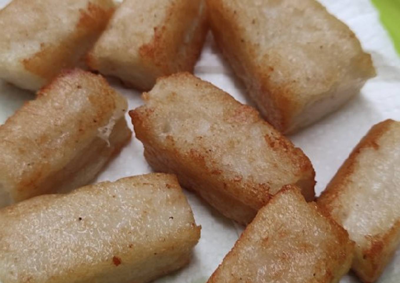 - Potong-potong kue lobak sesuai dengan selera. Kemudian goreng hingga setiap sisi berwarna coklat.