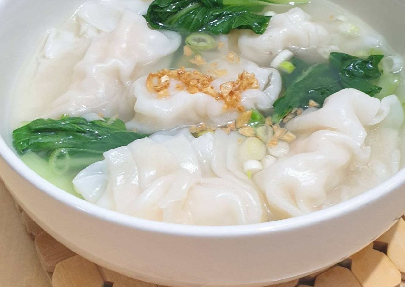 - Swekiau siap di sajikan dengan kuah kaldu ayam, minyak bawang putih goreng, dan potongan daun bawang