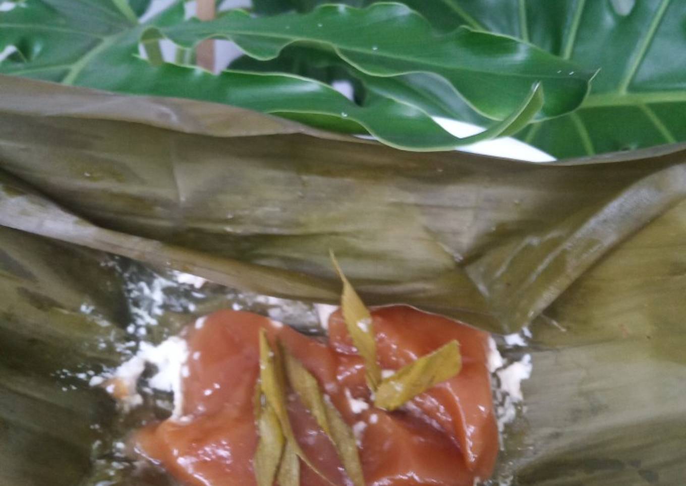 - Panaskan daun pisang sebentar sampai berubah warna agar tidak mudah sobek dan masukan isian nya sesuai selera.