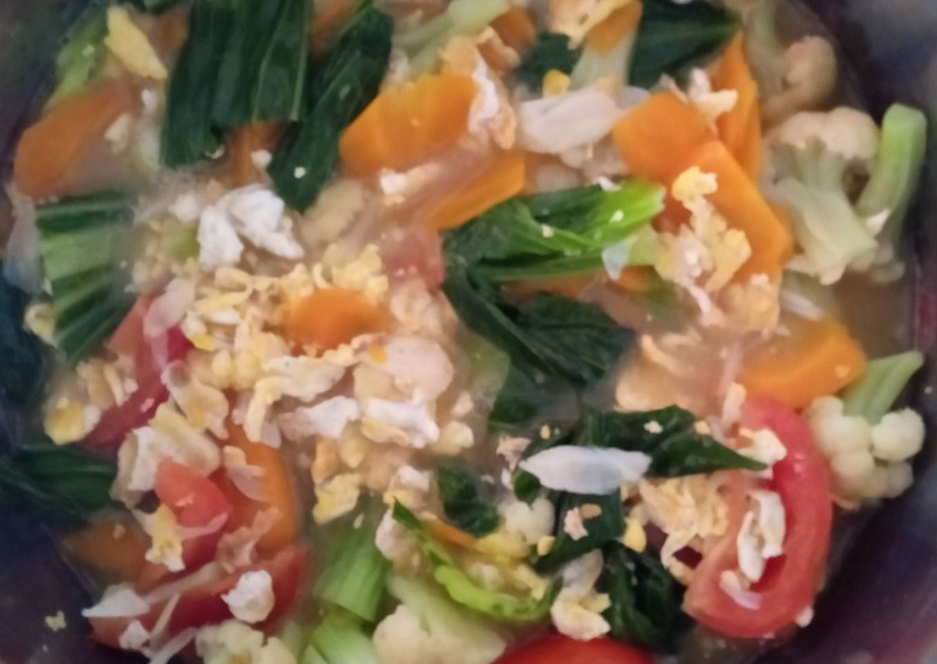 - Setelah air mendidih dan wortel/kembang kol empuk, masukkan potongan pokcoy dan aduk kembali hingga pokcoy layu. Kemudian masukkan tomat dan aduk kembali.
